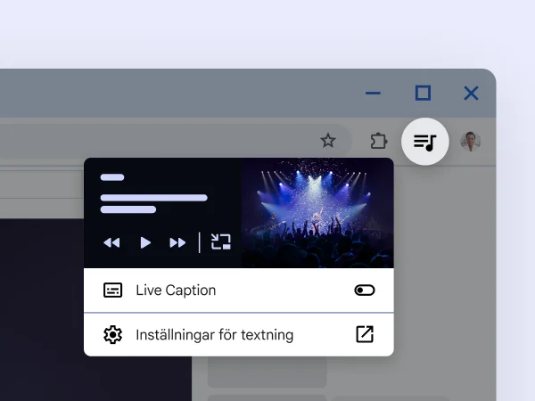 Chrome har stöd för skärmläsare och förstoringsglas och erbjuder helbildszoom, färger med hög kontrast, AI-bildbeskrivningar, livetextning, surfande med hjälp av tangentbordet med mera – vilket gör det enklare än någonsin att surfa på webben på sätt som passar dig.