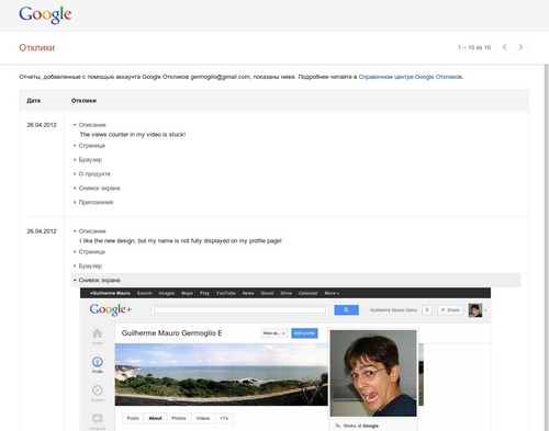 Вы можете просмотреть отзыв на странице Мои сообщения. Там можно увидеть все сведения, отправленные вами с помощью инструмента "Отклики", который доступен в большинстве продуктов Google.
