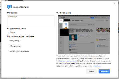 Нажмите Далее, чтобы просмотреть отзыв перед отправкой. На этом этапе вы можете изменить описание проблемы. В Google Отклики, помимо отзыва и скриншота, отправляются следующие сведения: